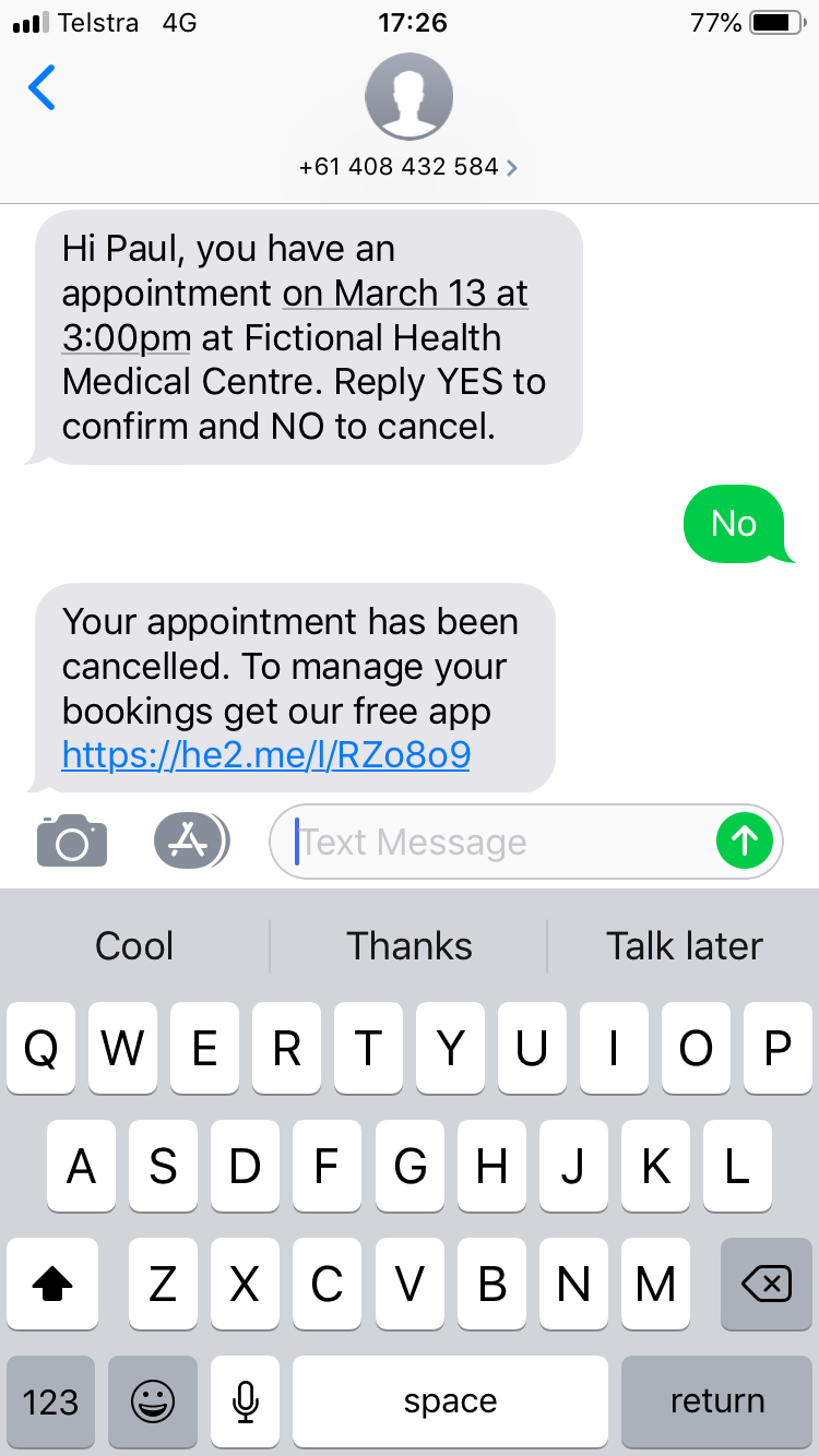 A follow-up SMS is sent to patients after they confirm or cancel their booking. If your practice has the Online Booking System and/or Patient Match, a link to the Healthengine app is provided in the SMS following cancellations to help patients to re-book their appointment for another time.