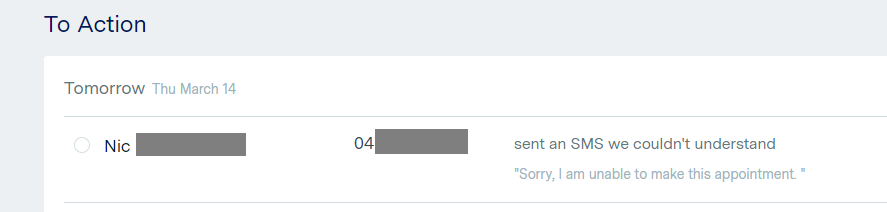 Any other responses won't be recognised by the Reminders Plus system and will be recorded in the 'To Action' list in your Reminders Plus dashboard in Practice Admin for your review.