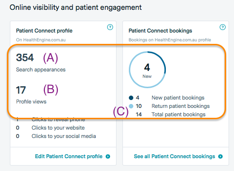 Another statistic to consider is your search appearance, illustrated by letter A in the image above. One way practices can increase that number is by publishing more appointments. You only appear in the default searches if you have available appointments within the search parameters, so don’t be shy! The rate of profile views out of search appearances can be increased through the use of our featured listing products to gain more visibility, even across suburbs outside your search radius, and also by improving the appearance of your practice in the search results.