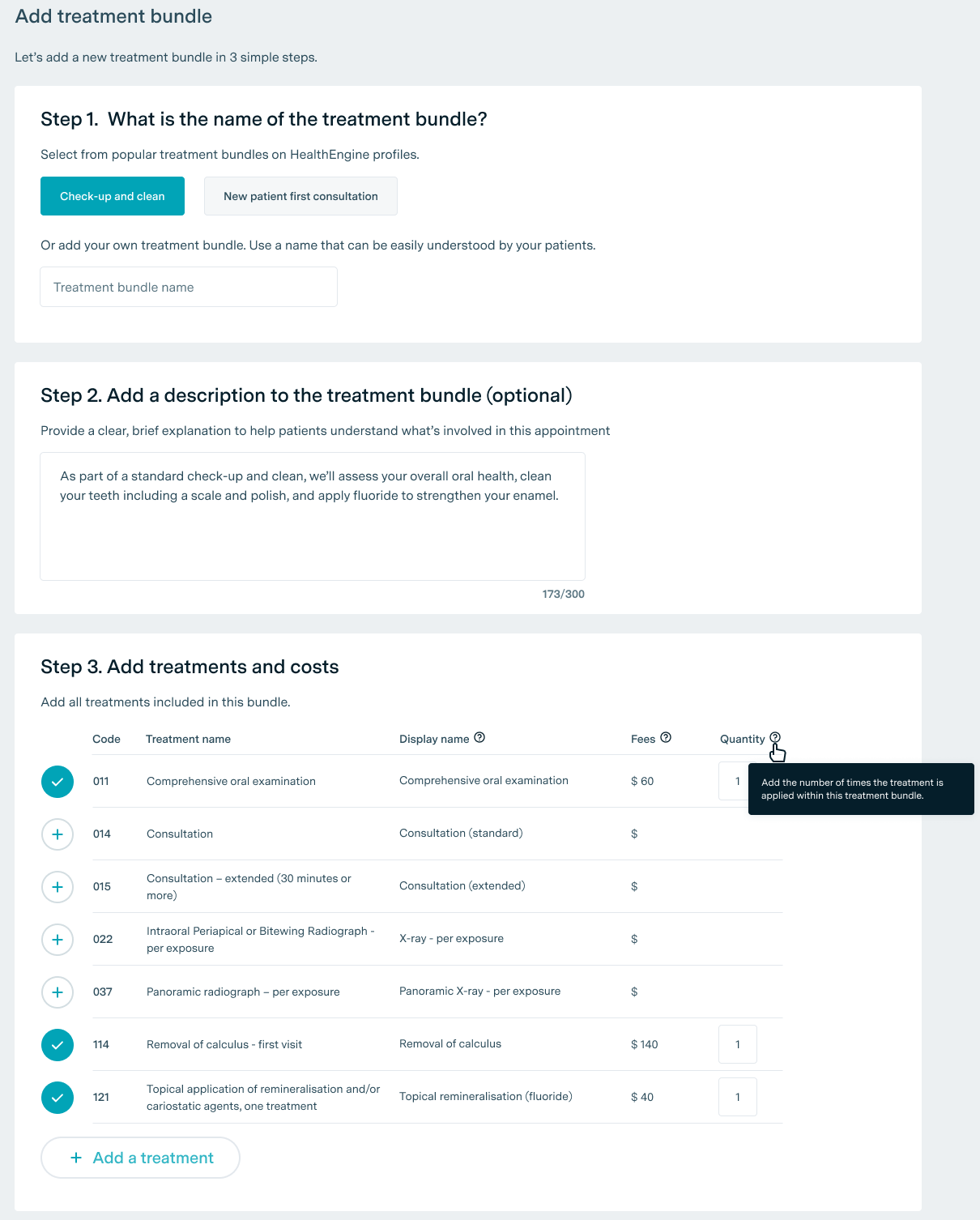 While individual treatment pricing is still useful, to really help patients understand what’s involved in their potential appointment, you can create treatment bundles for each of your common (or even uncommon) appointment types.