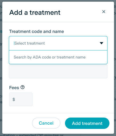 To add a treatment, simply click on Add Treatment, and you’ll be able to select from a searchable dropdown box containing all ADA codes and treatment names, and customise the display name.