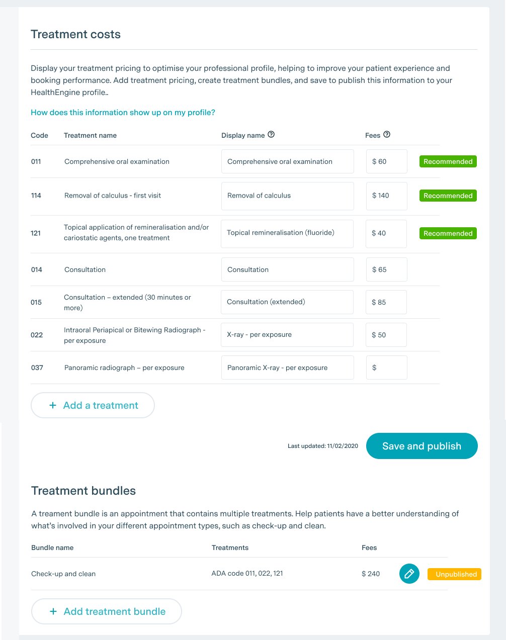 Treatments will only be displayed on your Professional Profile if you’ve entered a fee and clicked Save & Publish.
