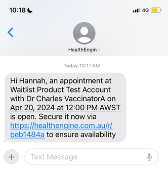Once an appointment has become available, you have the ability to send a customisable SMS to a patient. The patient will receive an SMS that looks like below, that directs them either to the practice profile or to the booking form.