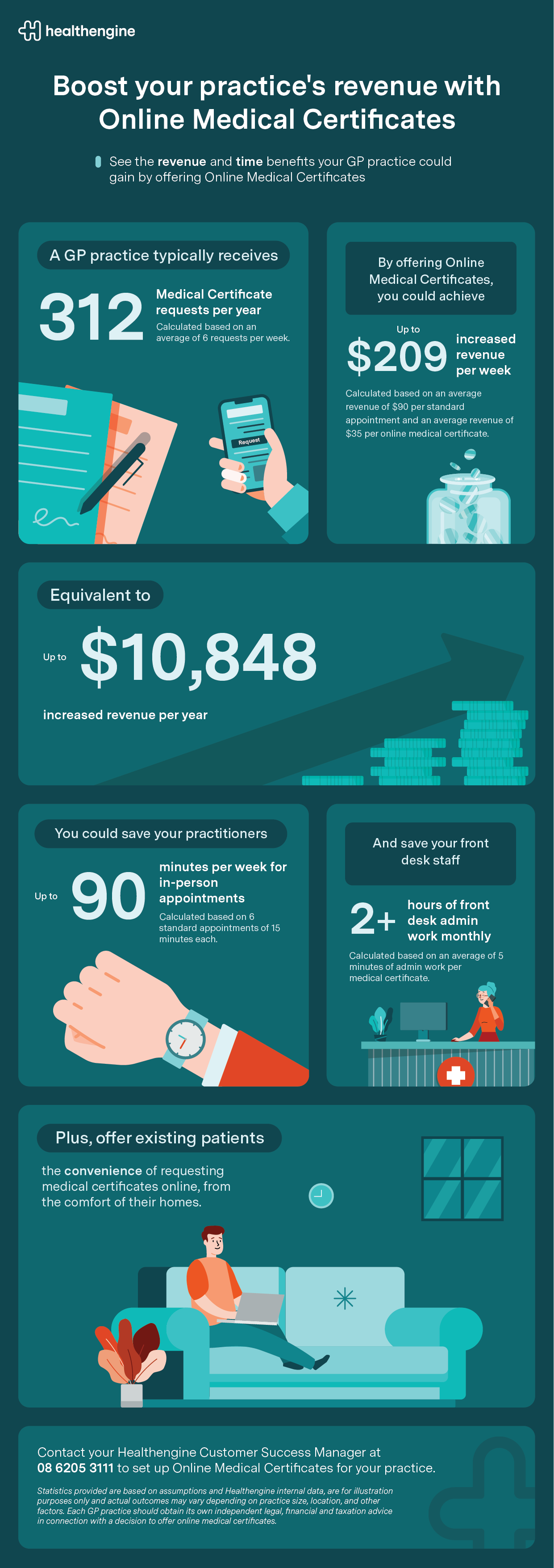 Explore the revenue and time benefits your GP practice could gain by offering Online Medical Certificates in our infographic below.