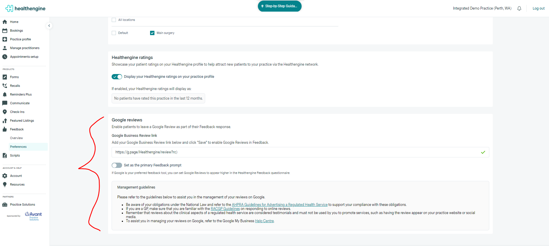 Depending on what is important to your practice, you might prefer to capture Google reviews from patients over Net Promotor score (NPS) and Healthengine marketplace rating results. If this is the case, you can adjust the way Healthengine requests feedback from patients to either prioritise them filling in Google Reviews for your practice, or filling in the standard Feedback questions. Both sets of feedback flows ask the same questions, just in a different order as patients are more likely to fill in the first few questions in a survey.